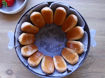 Trempez légèrement chaque biscuit à la cuillère dans le sirop d’imbibage et placez-les tout autour du moule.