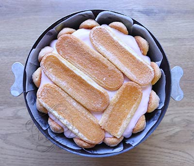 Recouvrez avec une couche de biscuits à la cuillère légèrement imbibés de sirop.