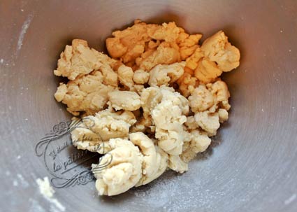 3. Afin de lier la pâte, il vous faudra un peu d’eau : 5 cl environ. Mélangez ensemble le sucre et l’eau et versez doucement dans la préparation. Selon la qualité du beurre et le poids du jaune