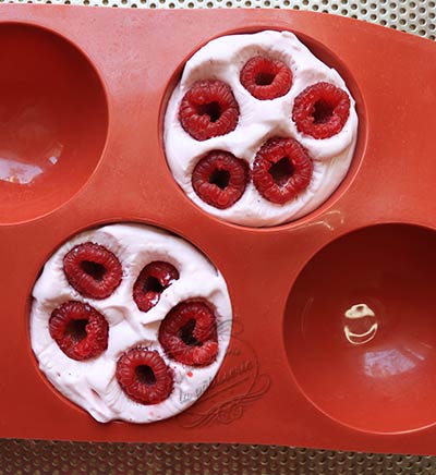 9. Enfoncez des framboises dans chaque mousse. J’en ai mis 5 ou 6 dans chaque.
