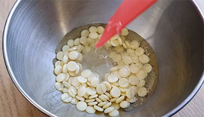2. Coupez le chocolat blanc en petits morceaux (pas besoin de couper si vous utilisez des pistoles comme moi).