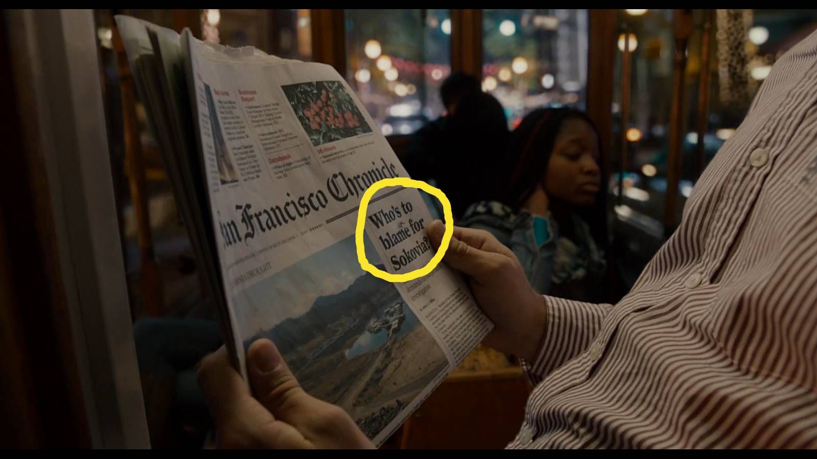 Le journal de ce passager de bus contient un article interrogeant sur l’identité des responsables du drame sokovien. Une référence à Avengers: l’ère d’Ultron, sorti quelques mois avant Ant-Man, et qui a montré la façon dont les Avengers ont détruit une partie du pays en tentant d’arrêter le dangereux robot. Cela annonce l’intrigue de Captain America: Civil War, film suivant du MCU à l’époque.