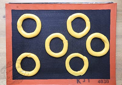 Pour des choux ou des Paris-Brest bien formés, je vous conseille de réaliser des empreintes avec un emporte-pièce passé dans la farine. C’est super pratique !