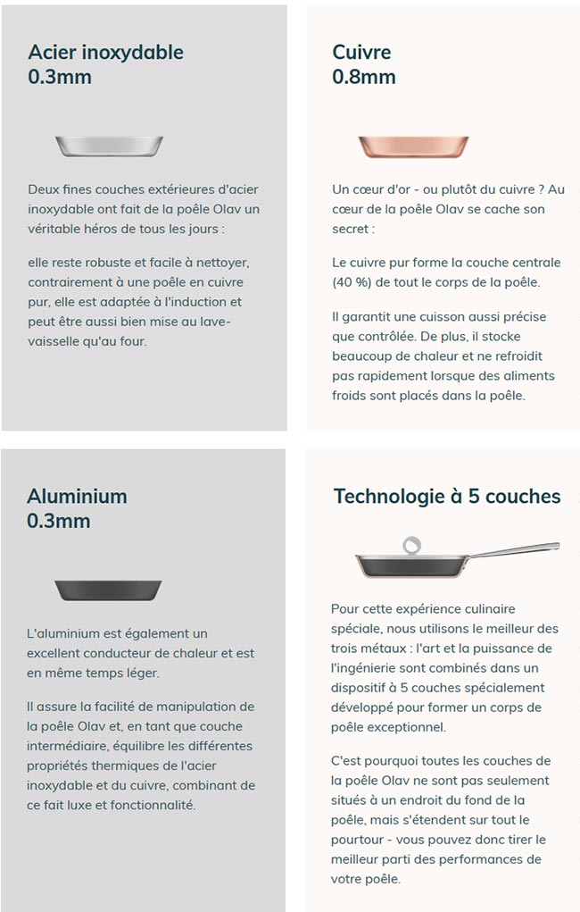 - Elles sont composées de 5 couches différentes : 2 fines couches extérieures d’acier inoxydable pour la solidité, 1 couche de cuivre (40% du total) au centre pour la chaleur, 2 couches d’aluminium pour faire tampon.