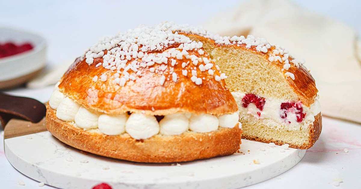 4. Avec un couteau à pain, coupez la brioche en 2. Pochez généreusement la crème sur la partie inférieure. Répartissez les framboises.