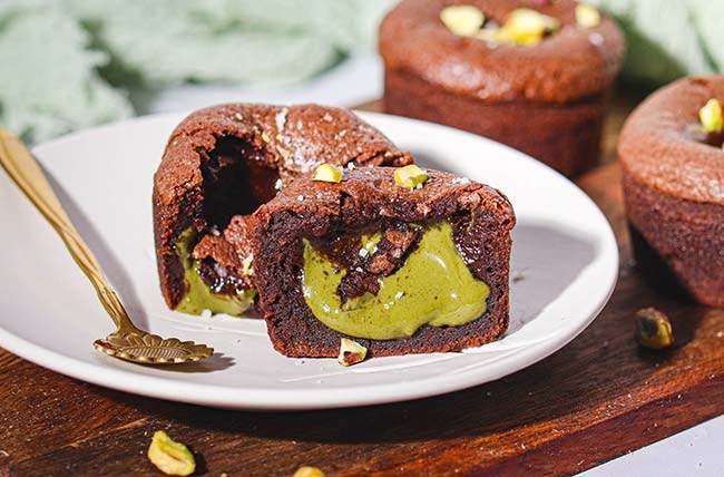 7. Enfoncez légèrement les coeurs pistache dans les fondants et enfournez 16 minutes à 200 °C. J’ai aussi testé une cuisson à 13 minutes mais c’était vraiment ultra coulant. Après, c’est selon les goûts ! Quoi qu’il soit, il faut toujours adapter les cuissons selon son four.