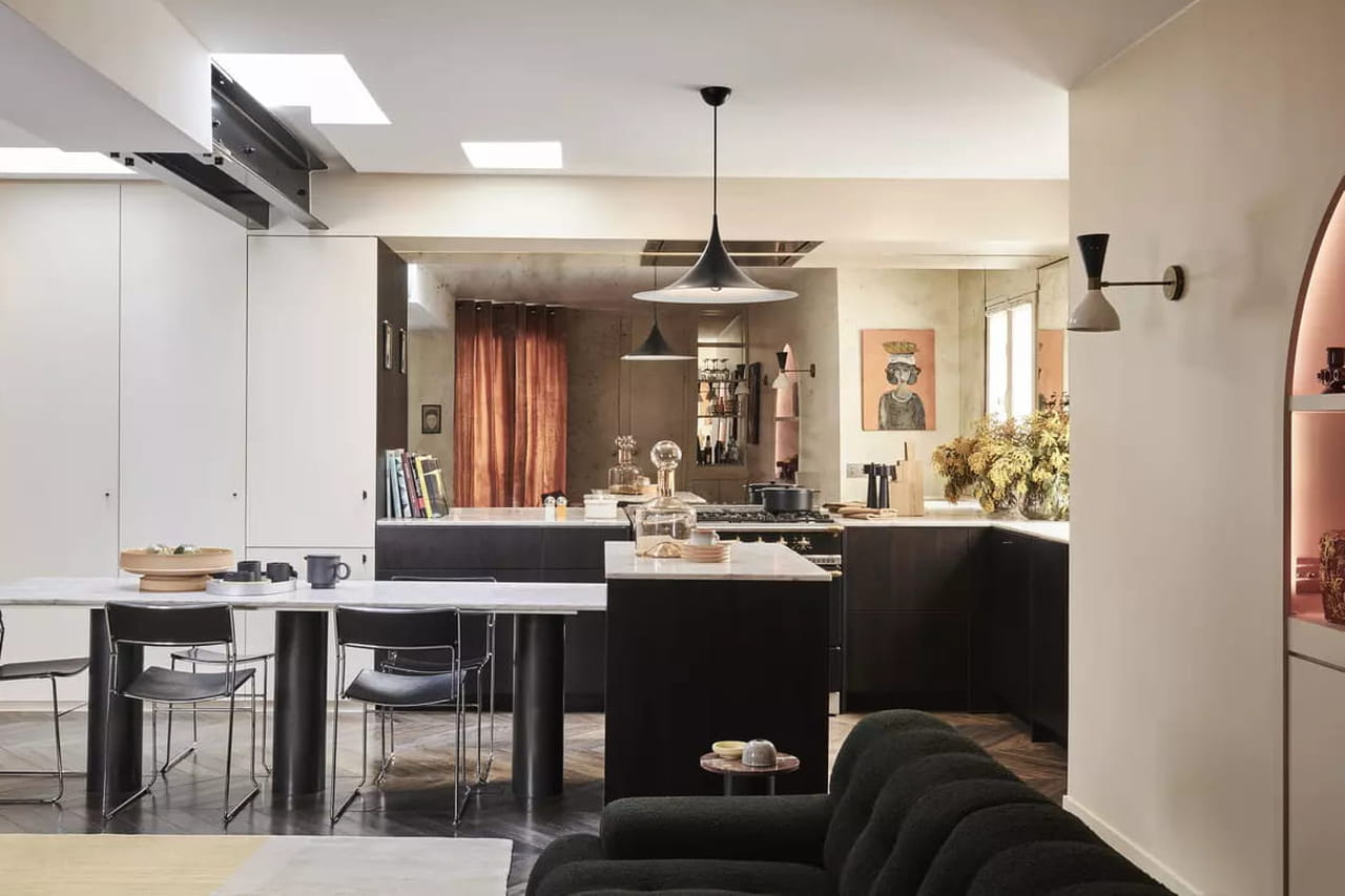 90 m² à Paris, c’est une belle surface surtout pour deux. Mais cet appartement était mal distribué. Il était séparé en 10 espaces cloisonnés (comme les toilettes, une pièce de rangement…) ainsi que deux chambres alors que les propriétaires n’avaient besoin que d’une. Ce découpage donnait l’impression d’un espace plus restreint. Ce couple, d’origine russe pour lui et mexicaine pour elle, voulait un grand espace décloisonné avec cuisine, salon et salle à manger dans la même pièce. Ils aiment recevoir et voulaient un lieu qui soit le plus convivial possible.