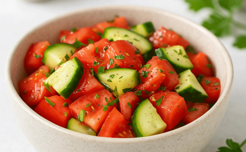la salade de tomate et concombre est légère, hydratante et rafraîchissante.