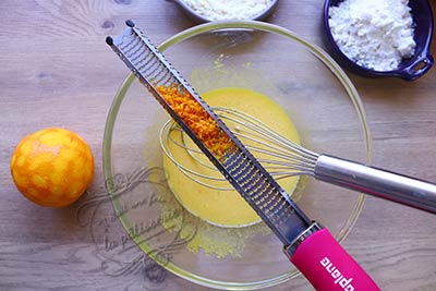 4. Lavez les oranges, et zestez-les directement dans la préparation.Je vous conseille d’utiliser une râpe micro-plane afin d’avoir les zestes les plus fins possibles.