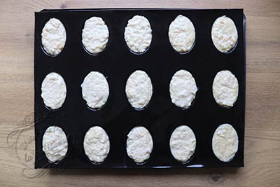 5. Répartissez le riz au lait dans les moules à mini-savarins posé sur une plaque perforée.