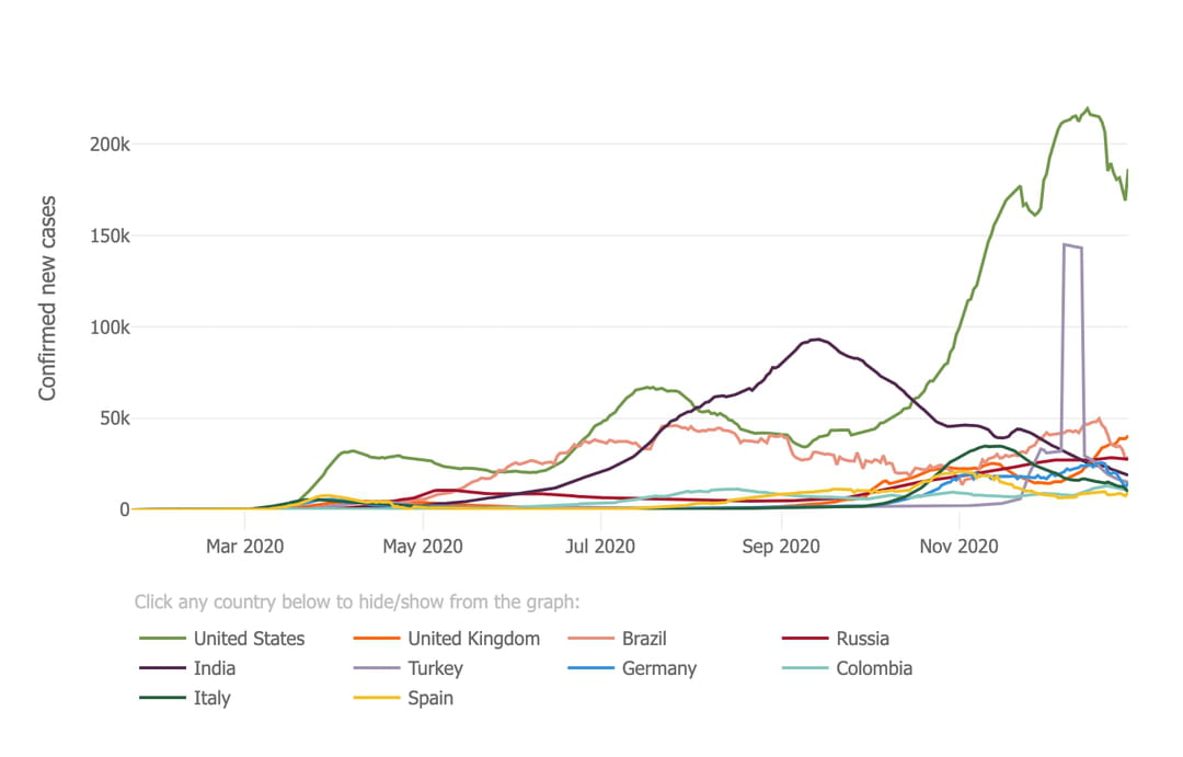 Courbe d’évolution des cas journaliers du Covid-19 dans le monde jusqu’au 29 décembre 2020