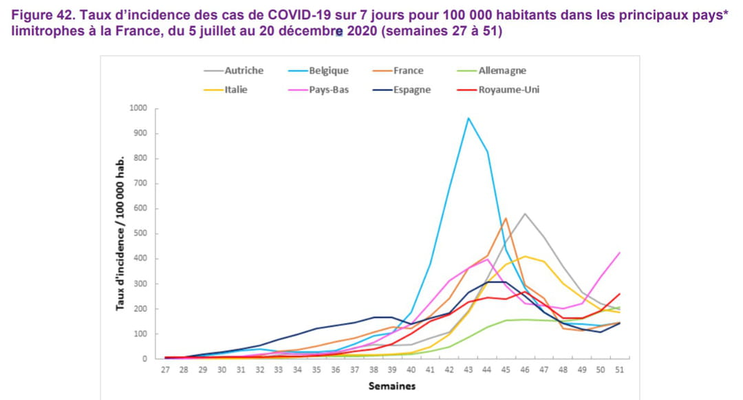 Taux d’incidence des cas de COVID-19 sur 7 jours pour 100 000 habitants dans les principaux pays* limitrophes à la France, du 5 juillet au 20 décembre 2020 (semaines 27 à 51)