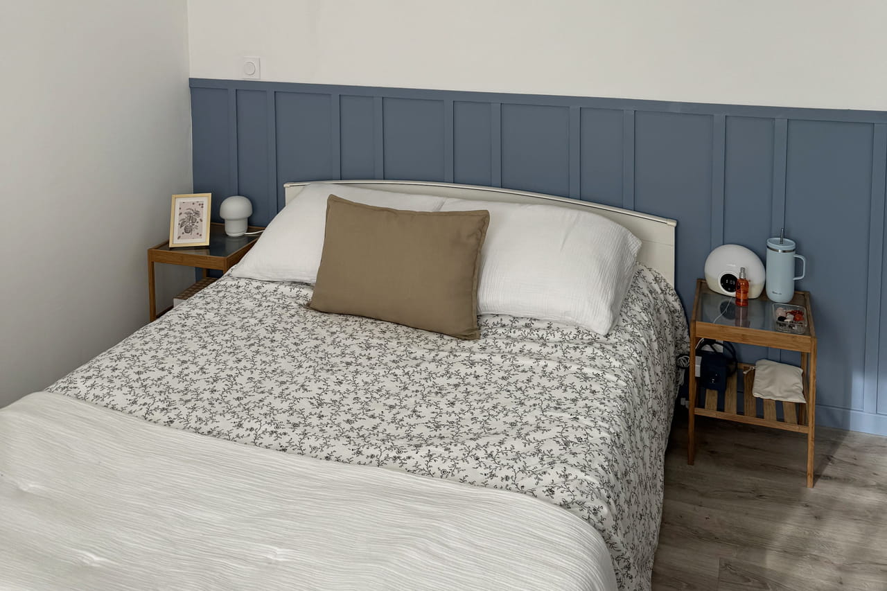 Afin de créer son propre soubassement mural dans l’esprit « Board and Batten » et ainsi offrir un nouveau look pour une nouvelle vie à sa chambre d’amis, Stacey, créatrice du compte Instagram @stacey_stachetti, a mis la main à la pâte. Avec un peu de temps, du matériel de pro et de l’huile de coude, donnez, vous aussi, vie à cette élégante tête de lit faite de tasseaux et d’amour. De quoi apporter du relief à votre pièce et la structurer visuellement.
